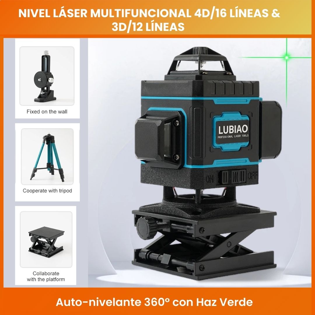 Nivel Láser Multifuncional 4D/16 Líneas & 3D/12 Líneas – Auto-nivelante 360° con Haz Verde