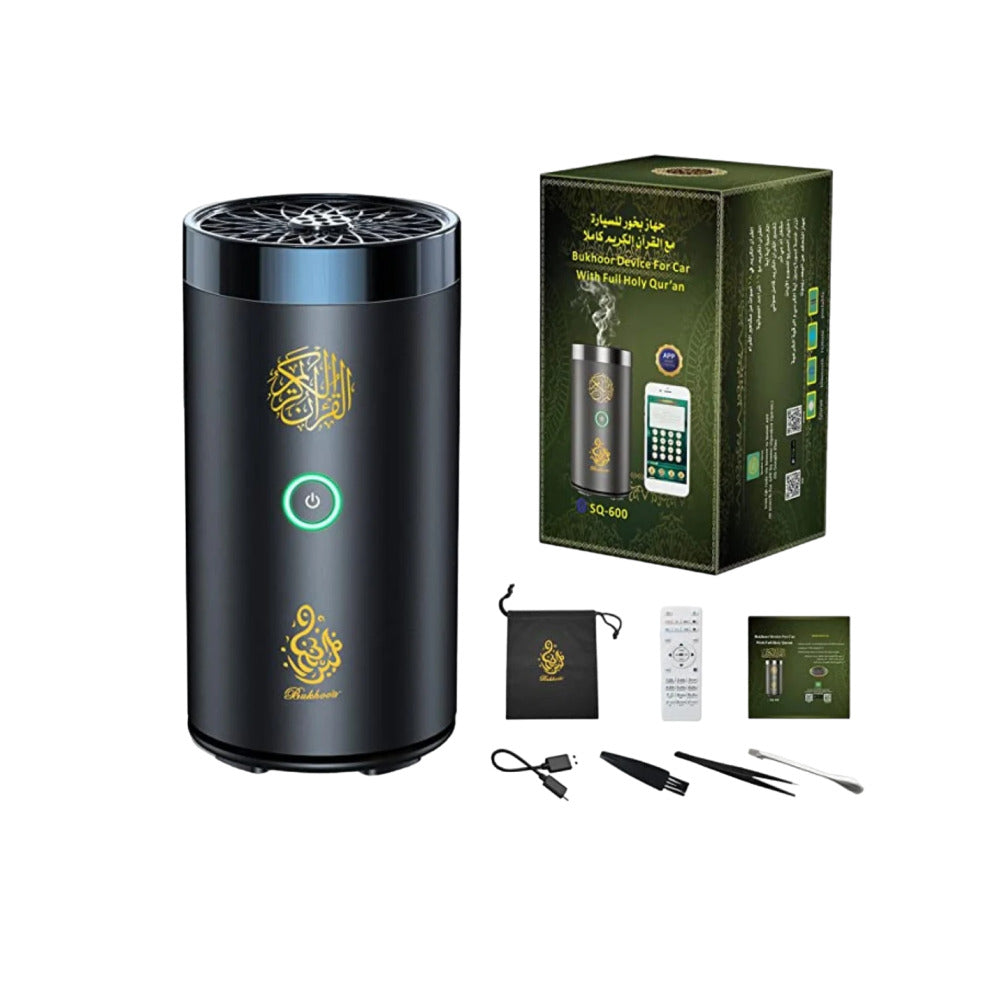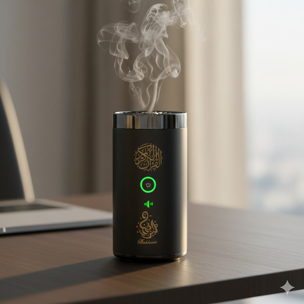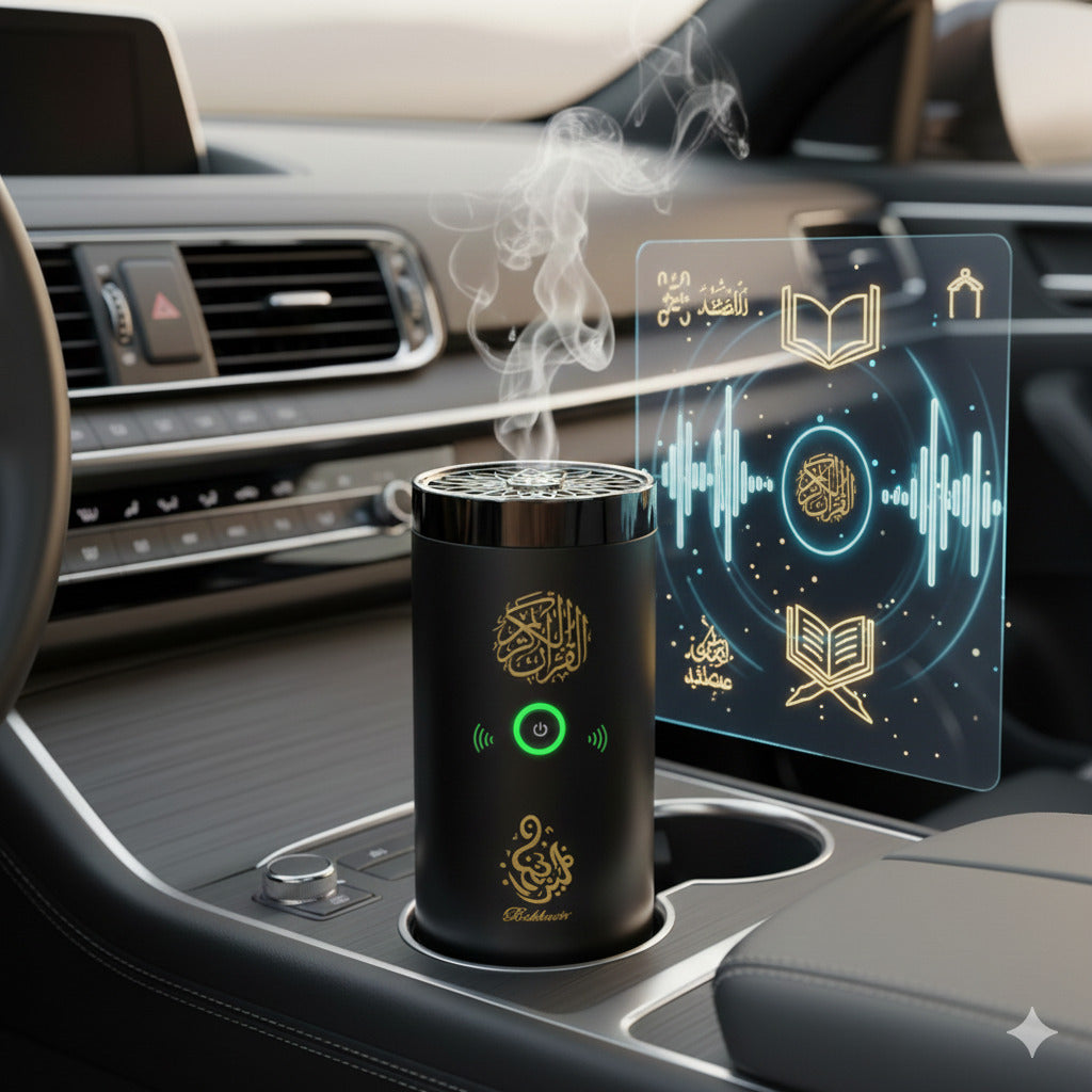 Eleva la experiencia de tu coche o tu hogar con un dispositivo que combina aroma de incienso puro con la reproducción del Corán completo, con voces múltiples, traducciones diversas y un diseño moderno y elegante.